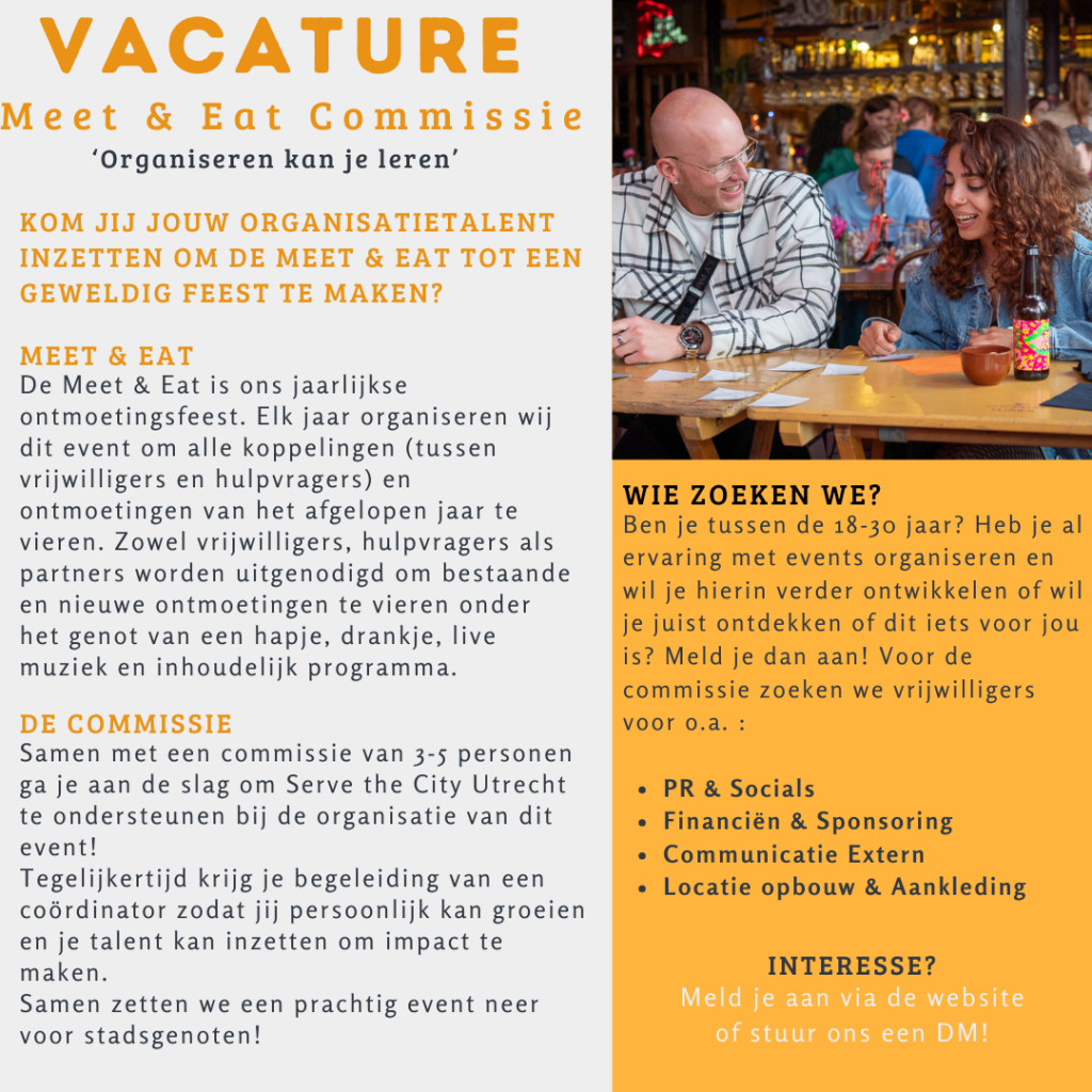 Voor onze Meet & Eat commissie zijn we op zoek naar enthousiaste vrijwilligers die zin hebben om mee te bouwen aan een geweldig event 🍽️🎉